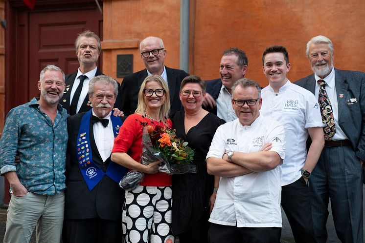 Lutefiskelskere gjennom 30 år: Her er noen av prisvinnerne gjennom tidene, i spedd andre lutefiskentusiaster. Fra venstre bakerste rad: Alex Rosén, Frode Kristensen, Peter Nagy, Christer Rødseth, Halvor Heuch. Foran fra venstre: Trym Eidem Gundersen, Heine Totland, Per Amble og Fru Timian. Ytterst til høyre ses ekteparet Pernille Høgli og Jørn Lie fra Gamle Raadhus. Paret fikk utdelt lutefiskelskernes hederspris for lang og tro tjeneste til lutefiskens ære.