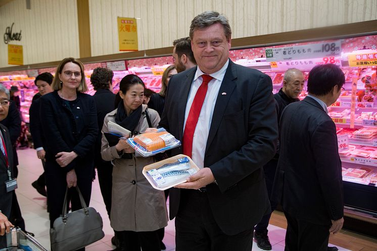 Fiskeriminister Harald T. Nesvik viser frem norsk sjømat på japansk supermarked