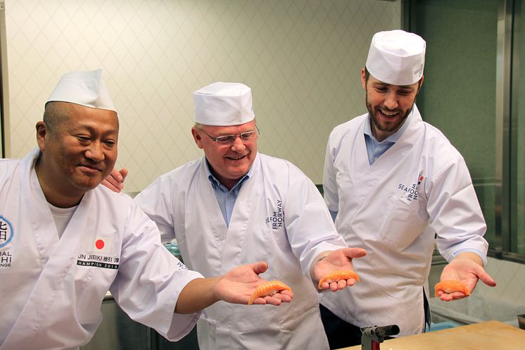 Fiskeriminister Per Sandberg og fiskeriutsending Gunvar L. Wie får et lynkurs i sushi av vedensmesteren.