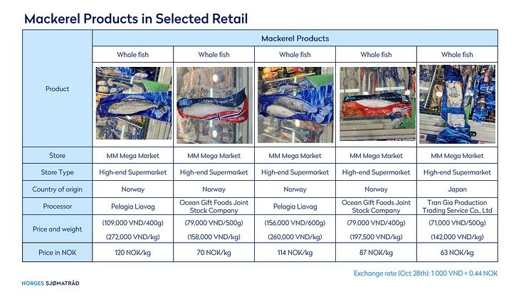 Et utdrag fra rapporten som vise et eksempel på ulike makrellprodukter i vietnamesiske butikker