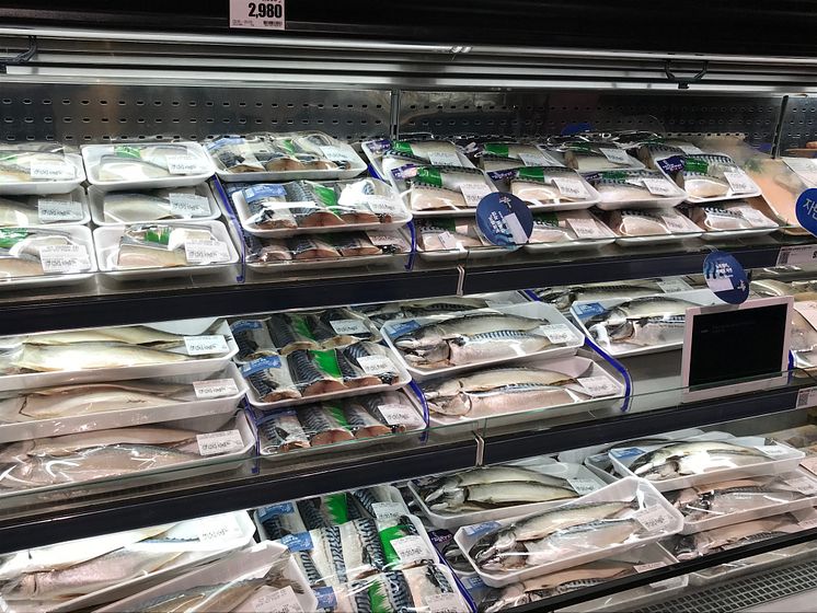 Makrell merket med "Seafood from Norway" er et vanlig innslag i butikkene i Sør-Korea