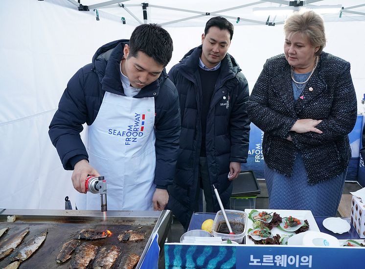 Statsminister Erna Solberg besøker Sjømatrådets stand på KTLivesite i Seoul under OL i Sør-Korea.