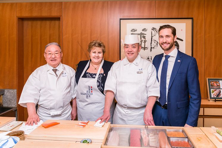 Statsminister Erna Solberg lager laksesushi i Japan