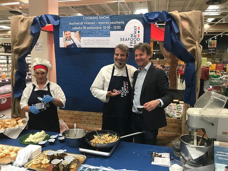 Tørrfiskambassadør Franco Favoretti og Sjømatrådets fiskeriutsending, Trym Eidem Gundersen, byr italienske butikkunder på velsmakende og lettlagde tørrfiskretter.