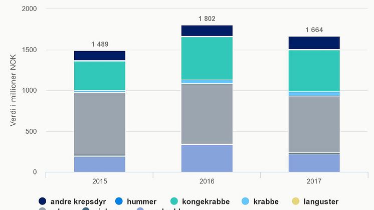 Norge har eksportert 40 000 tonn skalldyr for 1,7 milliarder kroner i 2017. Det er en volumreduksjon på 2 prosent og en verdireduksjon på 7 prosent fra rekordåret 2016.