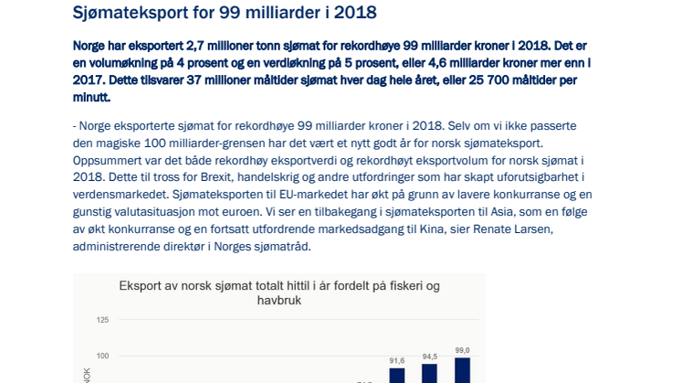 - Norge eksporterte sjømat for rekordhøye 99 milliarder kroner i 2018. Selv om vi ikke passerte den magiske 100 milliarder-grensen har det vært et nytt godt år for norsk sjømateksport. Oppsummert var det både rekordhøy eksportverdi og rekordhøyt eksportvolum for norsk sjømat i 2018. Dette til tross for Brexit, handelskrig og andre utfordringer som har skapt uforutsigbarhet i verdensmarkedet. Sjømateksporten til EU-markedet har økt på grunn av lavere konkurranse og en gunstig valutasituasjon mot euroen. Vi ser en tilbakegang i sjømateksporten til Asia, som en følge av økt konkurranse og en fortsatt utfordrende markedsadgang til Kina, sier Renate Larsen, administrerende direktør i Norges sjømatråd.