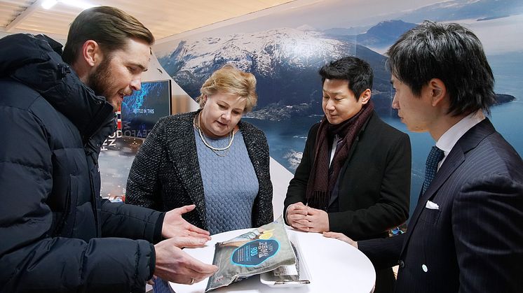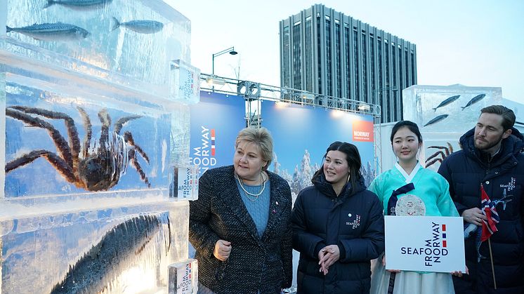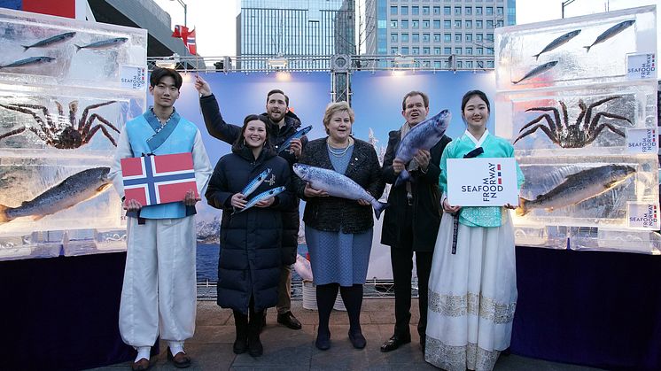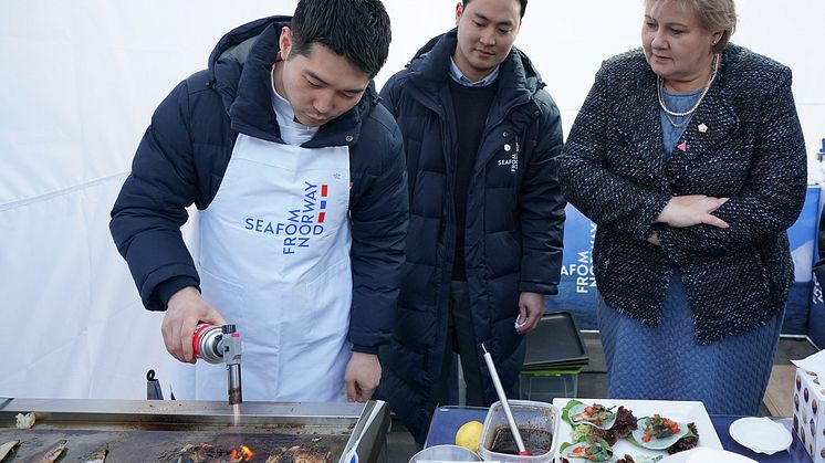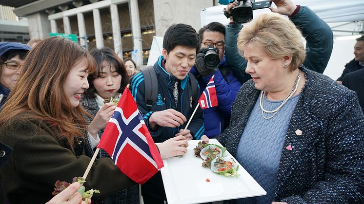Statsminister Erna Solberg lot seg imponere av hvordan norsk sjømat har vunnet folks hjerter i Sør-Korea. Da hun besøkte den norske standen på KTLivesite i sentrum av Seoul i går fikk hun se med egne øyne den posisjonen norsk makrell har i dette markedet, og benyttet anledningen til å dele ut gratisprøver til de mange fremmøtte.