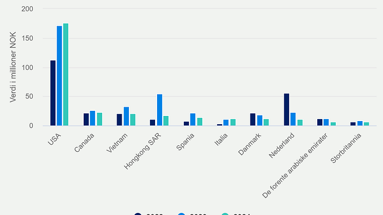 - Canada hadde størst verdivekst, med en økning i eksportverdi på 211 millioner kroner, eller 34 prosent, sammenlignet med første halvår i fjor