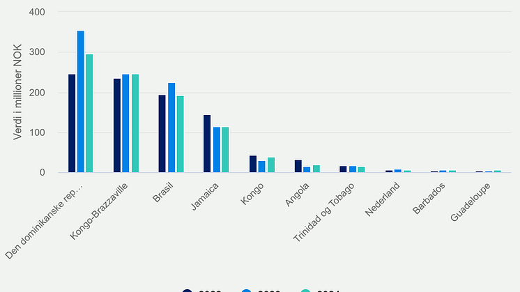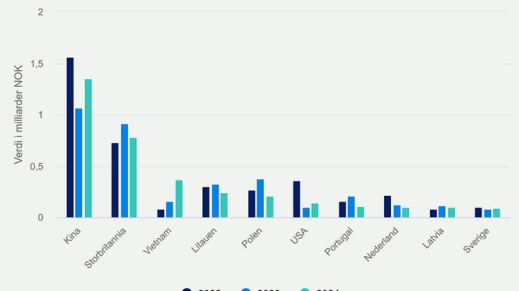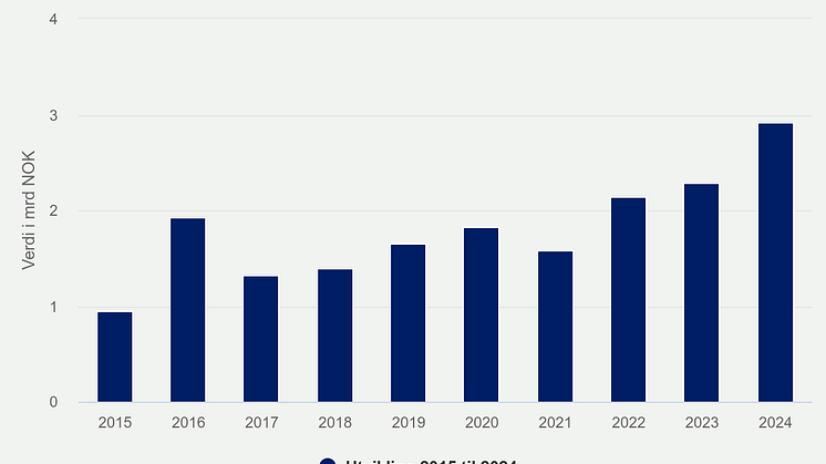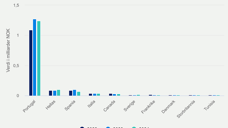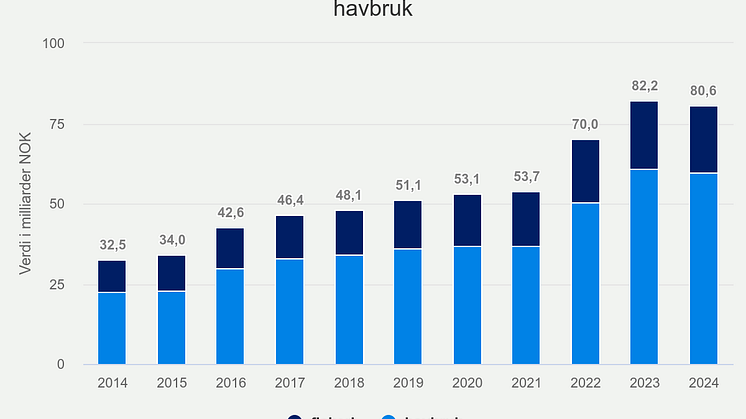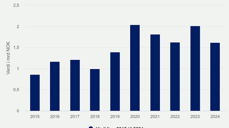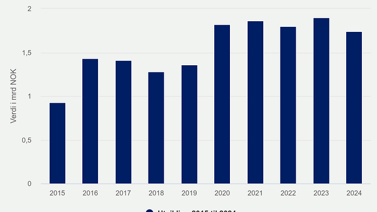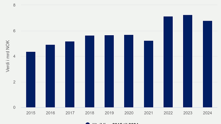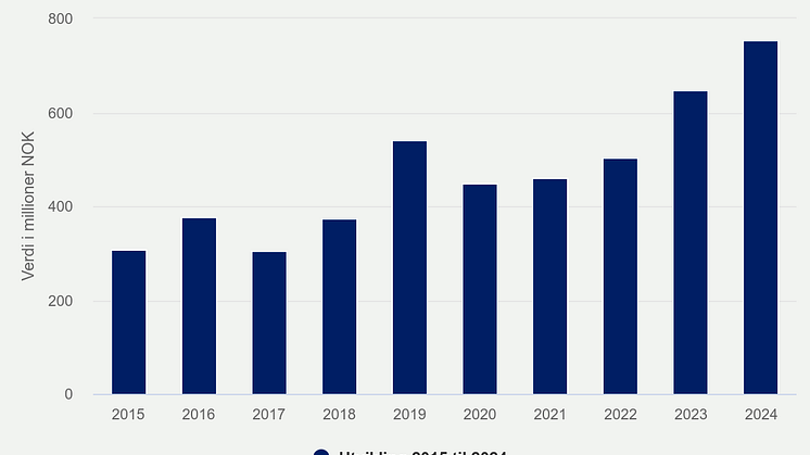Til sammenligning var eksporten i 2023 på 27 000 tonn, til en verdi av 455 millioner kroner.